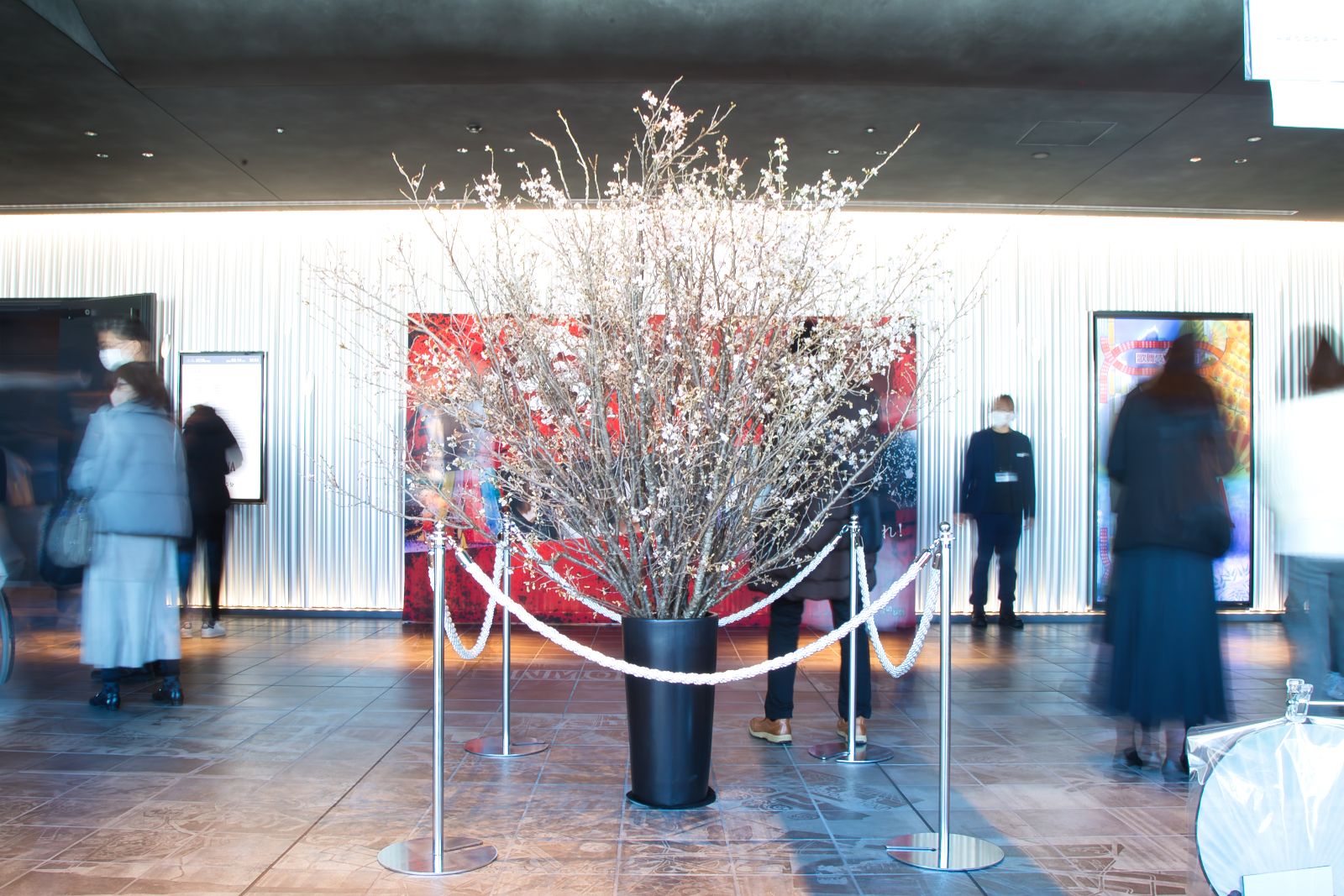 祭りの楽しい雰囲気は、 客席の外にも広がっている。劇団員のタペストリーに迎えられ向かったロビーでは、祭り囃子の音色とともに桜の木が眼前に現れる。この桜の木は本物なので、公演期間中に開花していく様子もお楽しみに。