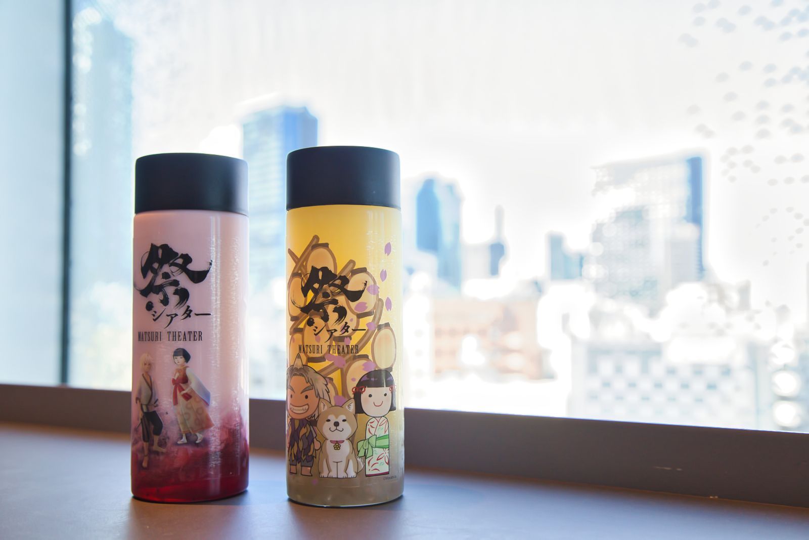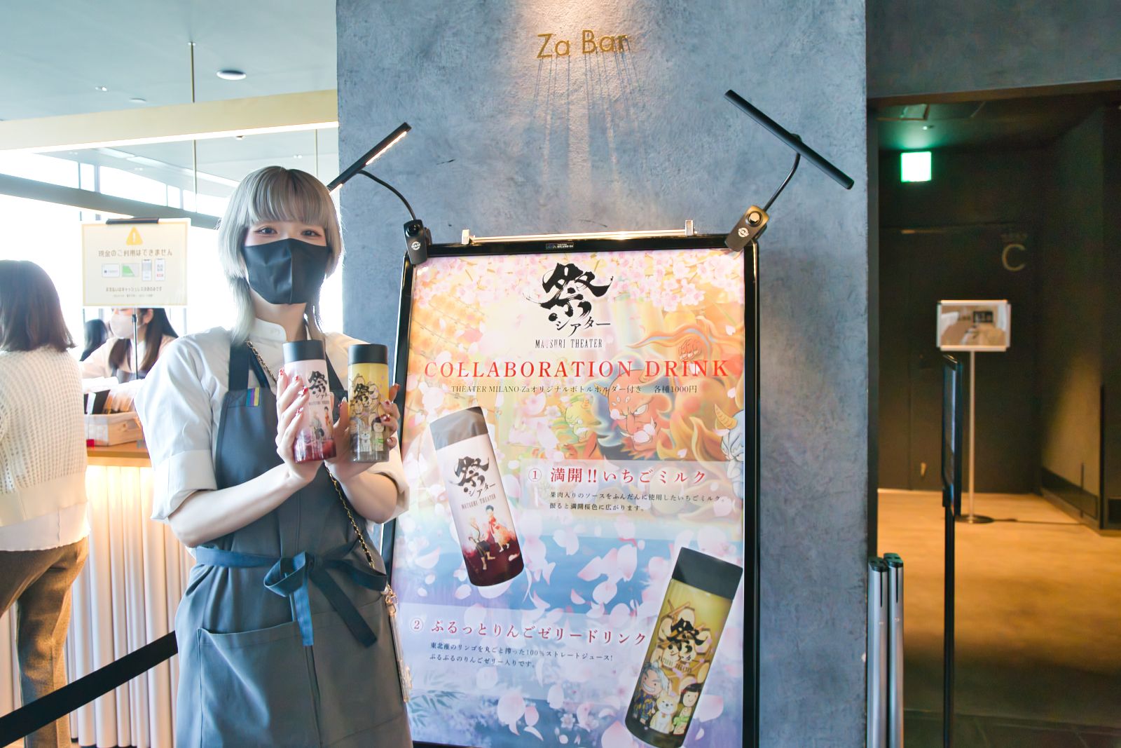 ロビーで買い物を楽しみ、桜や公演ビジュアル前で記念撮影を終えたら、ぜひ劇場内のバーカウンター「Za Bar」へ行ってみてほしい。祭シアター「HANA」公演期間中はコラボレーションドリンクとして、「満開‼ いちごミルク」と「ぷるっとりんごゼリードリンク」が販売中。鬼とオハナがあしらわれたオリジナルボトル入りなので、公演の前にしっかり糖分と水分を補給してから、全力で祭りに参加してみてはどうだろうか。
