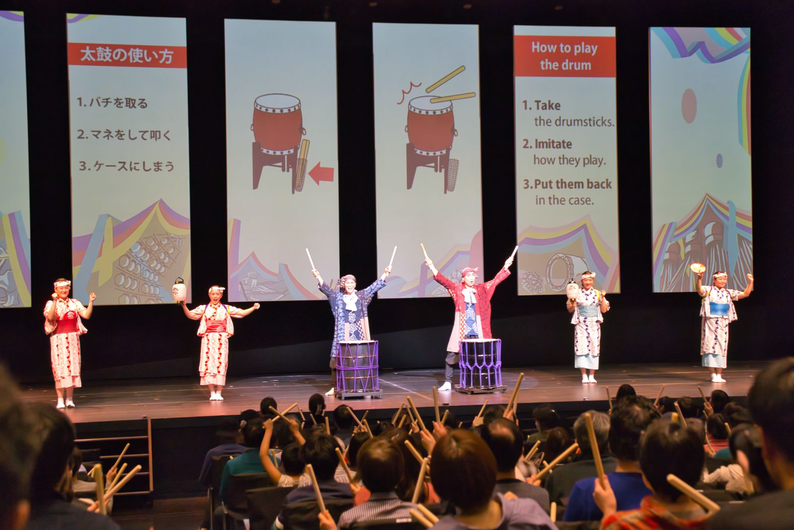 本作の祭り体験はそれだけにとどまらない。太鼓席と提灯シートにはそれぞれ、備え付けの立派な太鼓と提灯が設置されている。さらにうちわシートでは持ち帰れるうちわを振って祭りに参加できる、全シート参加型の作品だ。開演前には、本作の案内人である、おかしこ(三重野葵・小山雄大)の2人によるレクチャーのもと、観客は太鼓を鳴らしたり、提灯に明かりをつけて動かしたり。エンディングで劇場一体となって盛り上がる「6県ロール」の振付レクチャーも丁寧にしてくれるので、参加型ってどうしたらいいの?とドキドキしてしまう人も、安心して祭シアターの世界へと入っていけるだろう。