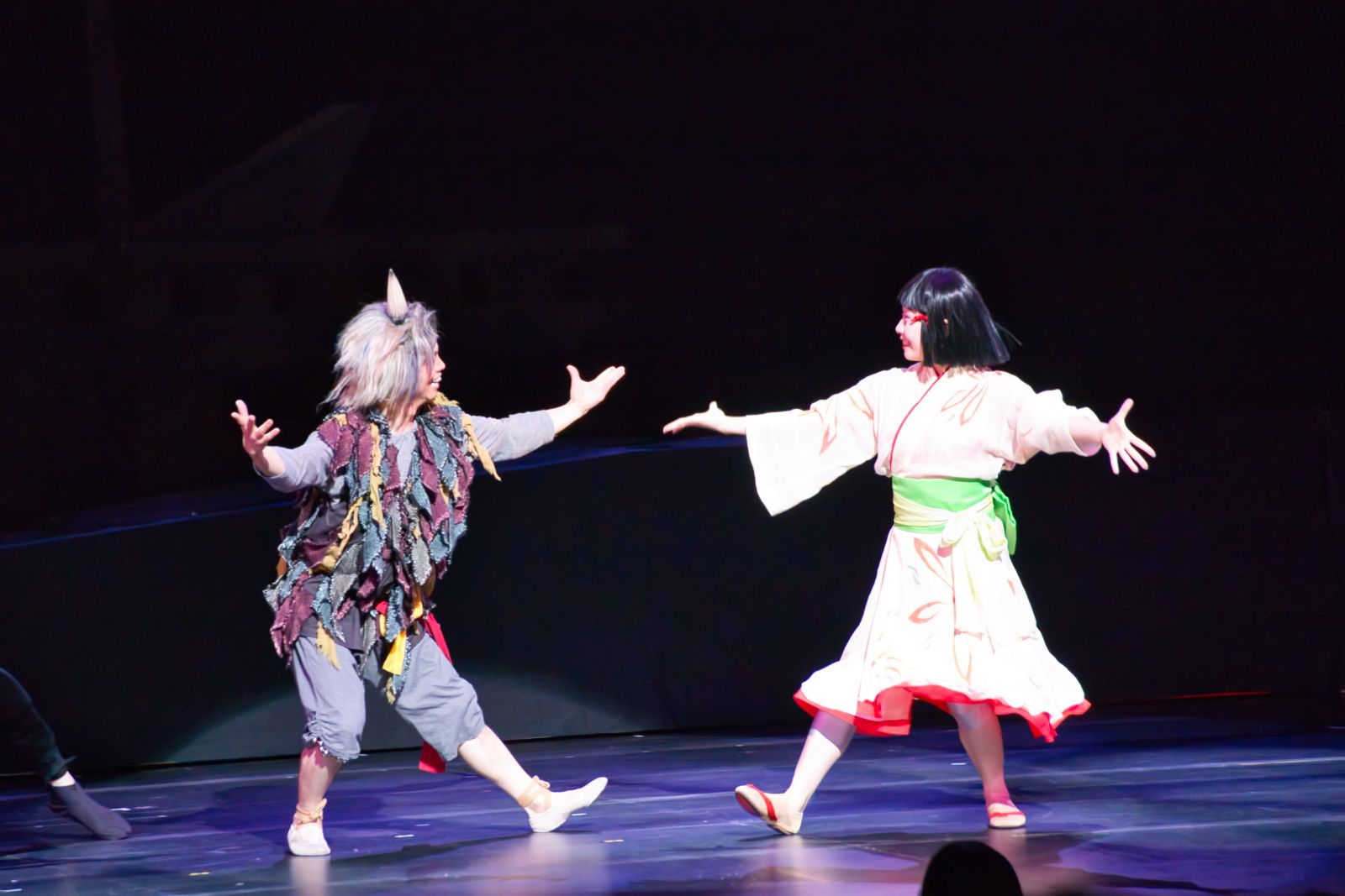 ノンバーバルで表現する本作。鬼とオハナは一言もセリフを発しない。代わりに、踊りと太鼓、笛の音で情感豊かに胸の内を語ってくれる。それぞれの祭りを舞台上で表現しながら、そこでの出会いを受けて変化した鬼やオハナの心境が、森下と冨樫の演奏と身体表現で彩られていく。序盤は不器用さを感じさせた鬼は、オハナを愛したことで柔らかな空気へと変化し、オハナが笛を吹き舞う姿には凛とした強さと美しさが漂う。