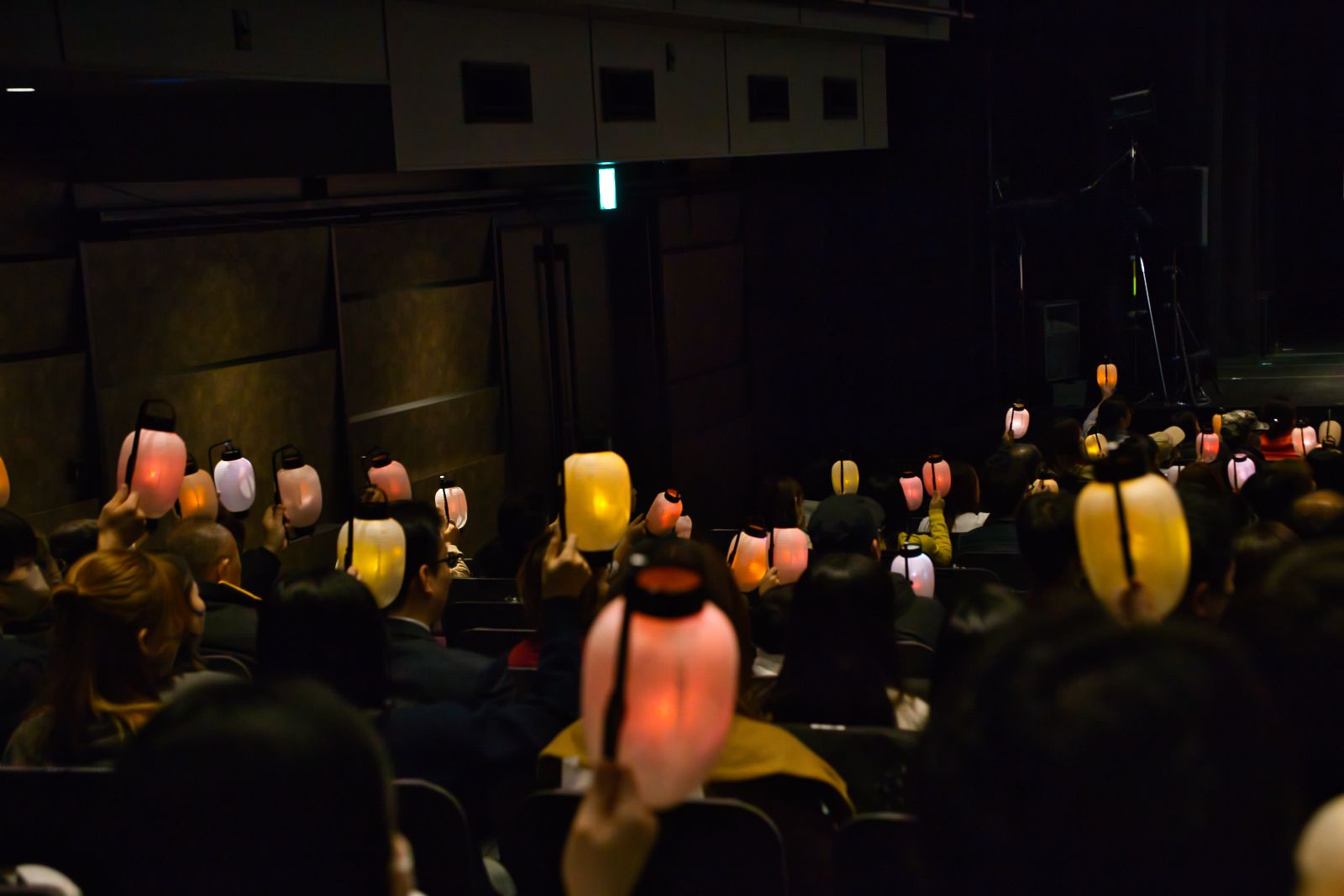 本作の祭り体験はそれだけにとどまらない。太鼓席と提灯シートにはそれぞれ、備え付けの立派な太鼓と提灯が設置されている。さらにうちわシートでは持ち帰れるうちわを振って祭りに参加できる、全シート参加型の作品だ。開演前には、本作の案内人である、おかしこ(三重野葵・小山雄大)の2人によるレクチャーのもと、観客は太鼓を鳴らしたり、提灯に明かりをつけて動かしたり。エンディングで劇場一体となって盛り上がる「6県ロール」の振付レクチャーも丁寧にしてくれるので、参加型ってどうしたらいいの?とドキドキしてしまう人も、安心して祭シアターの世界へと入っていけるだろう。