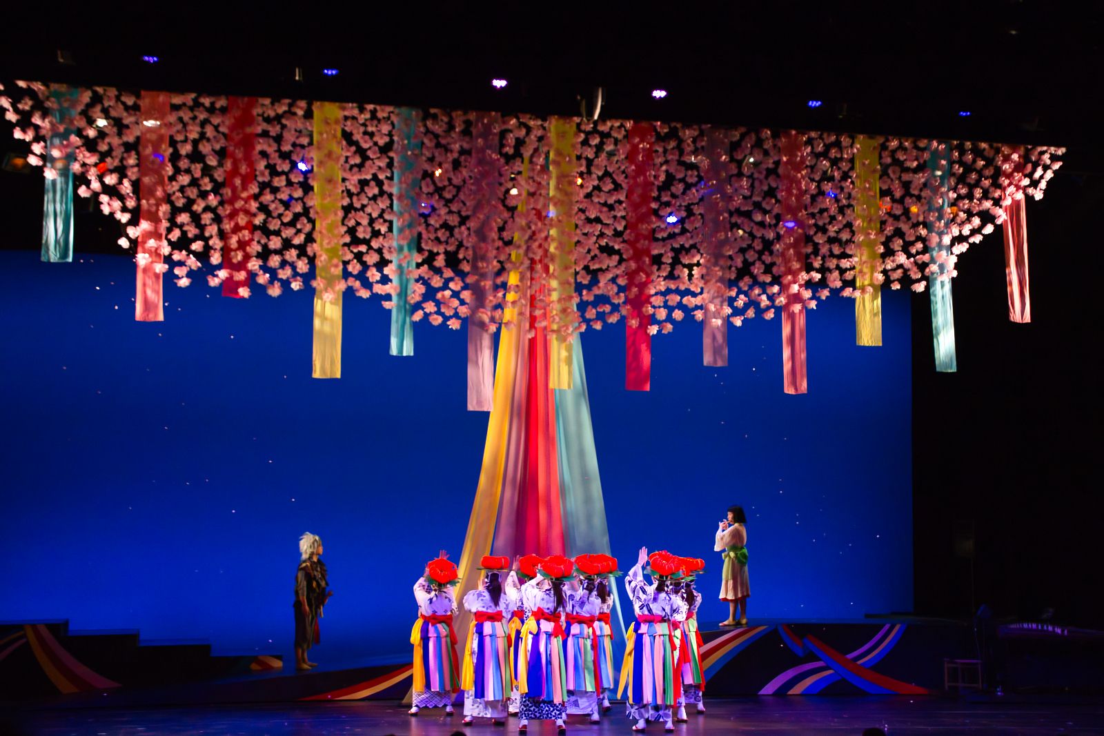 祭りの楽しい雰囲気は、 客席の外にも広がっている。劇団員のタペストリーに迎えられ向かったロビーでは、祭り囃子の音色とともに桜の木が眼前に現れる。この桜の木は本物なので、公演期間中に開花していく様子もお楽しみに。